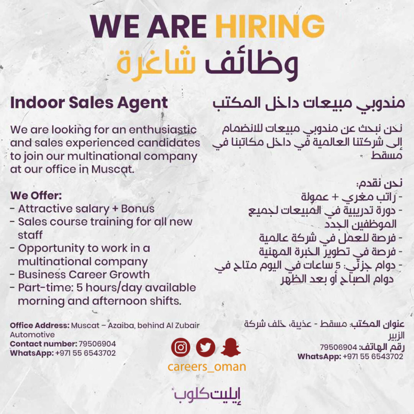 الأربعاء 2 / 3 / 2022 - شركة إيليت كلوب في مسقط - فرص عمل شاغرة ( مندوبي مبيعات )