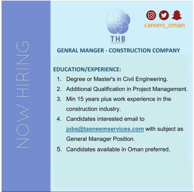 • الخميس 17 / 3 / 2022 - شركة THB - وظيفة شاغرة ( GENRAL MANGER - CONSTRUCTION COMPANY )