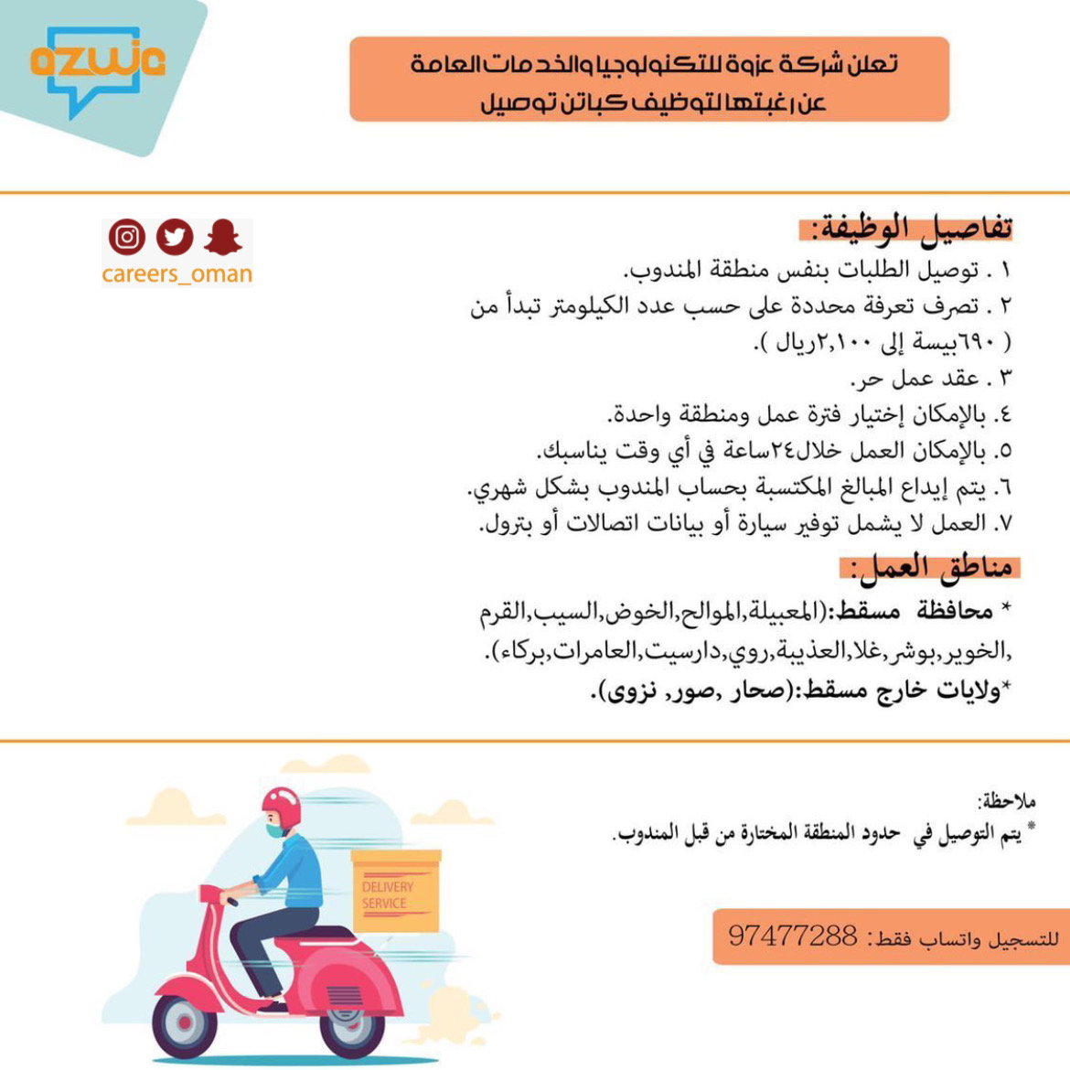 الموضوع: الاحد 10 / 4 / 2022 - شركة عزوة للتكنولوجيا والخدمات العامة - فرص عمل شاغرة ( كابتن توصيل )