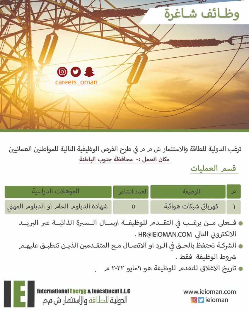 • الاربعاء 27 / 4 / 2022 - الدولية للطاقة والاستثمار - وظائف شاغرة ( كهربائي شبكات هوائية العدد 5 )