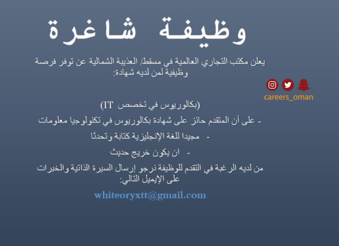 الاربعاء 18 / 5 / 2022 - مكتب التجاري العالمية في مسقط - وظيفة شاغرة ( IT )