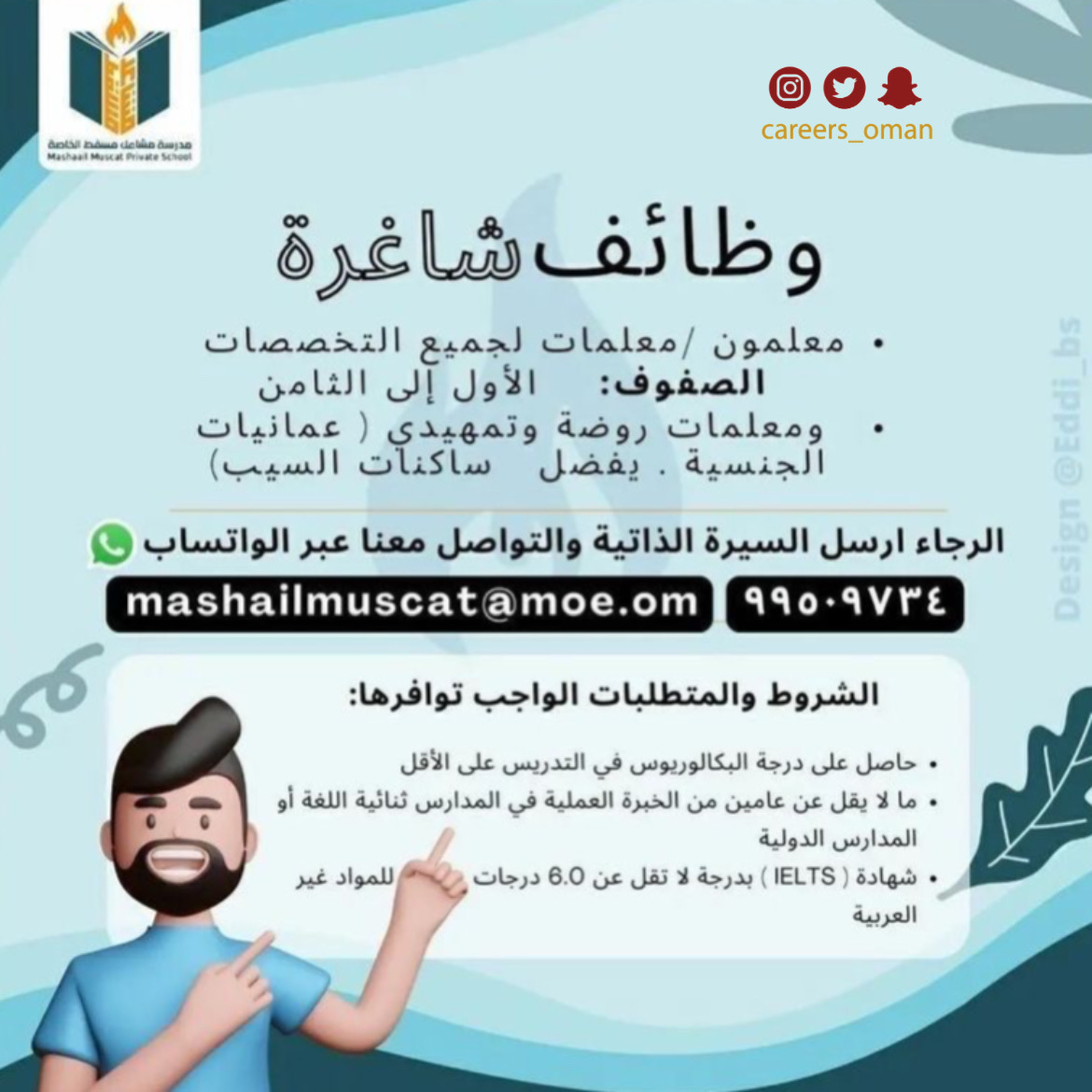 الاحد 29 / 5 / 2022 - مدرسة مشاعل مسقط الخاصة - وظائف شاغرة ( معلمون / معلمات لجميع التخصصات )