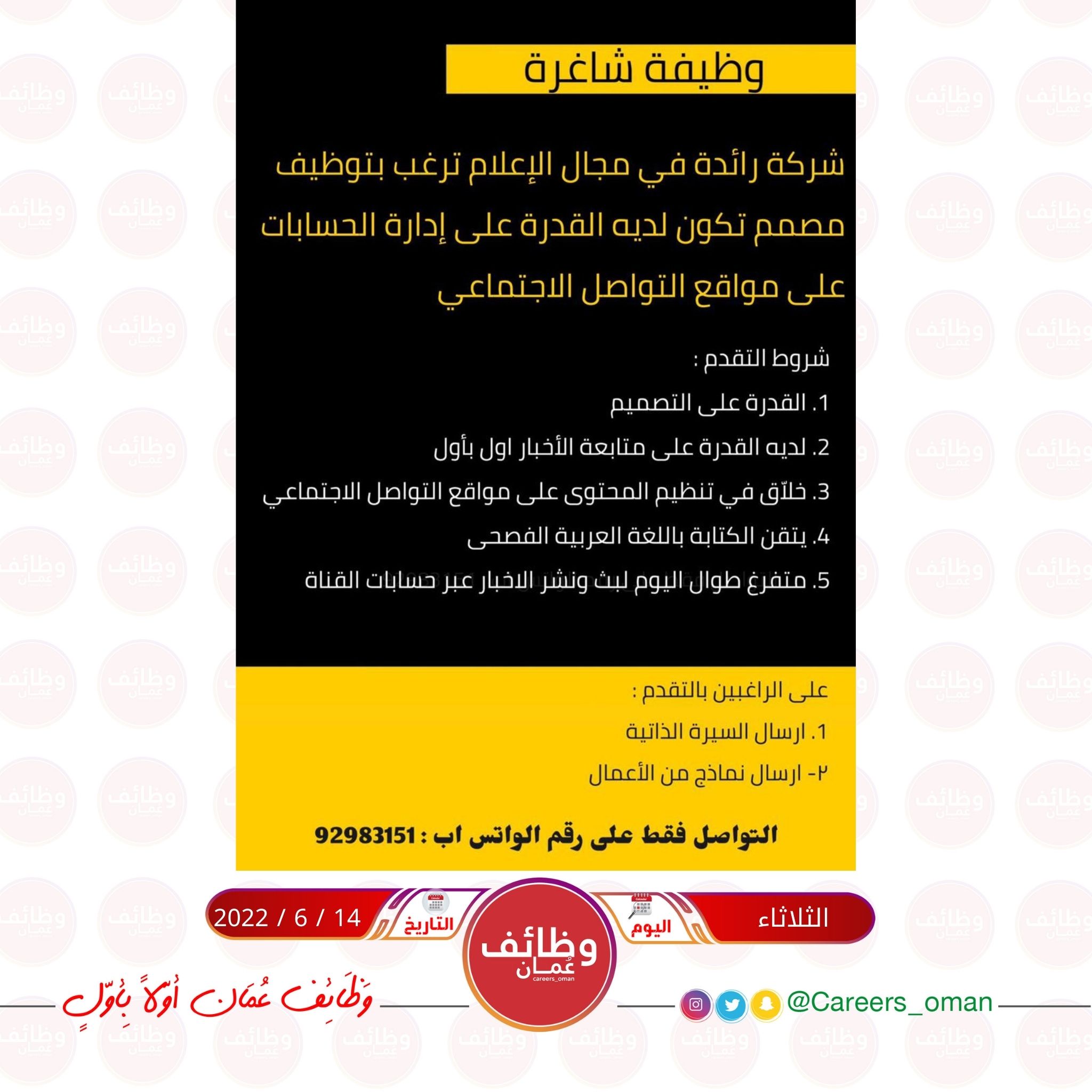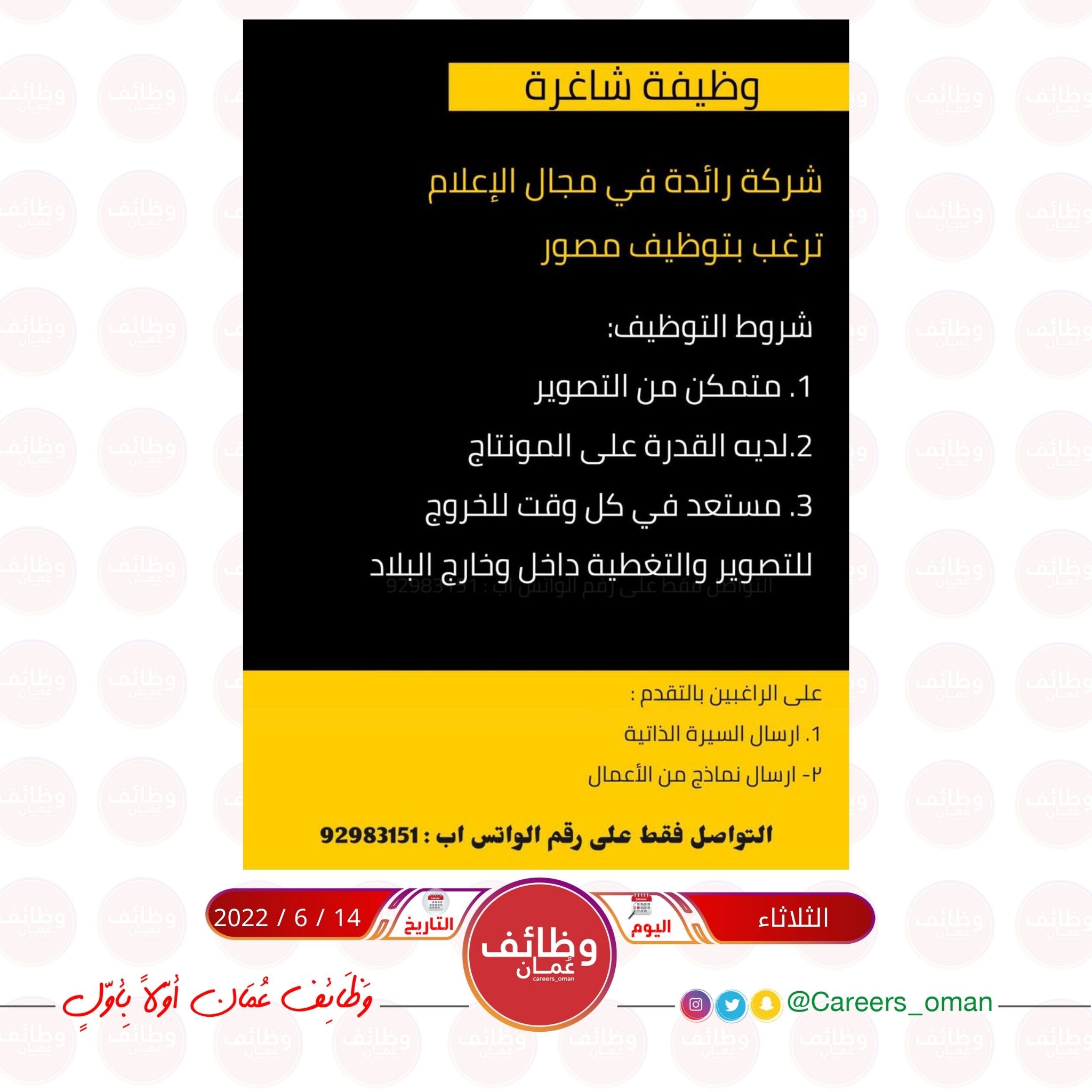 الموضوع: الثلاثاء 14 / 6 / 2022 - شركة رائدة في مجال الإعلام - وظائف شاغرة ( مصور + مصمم )