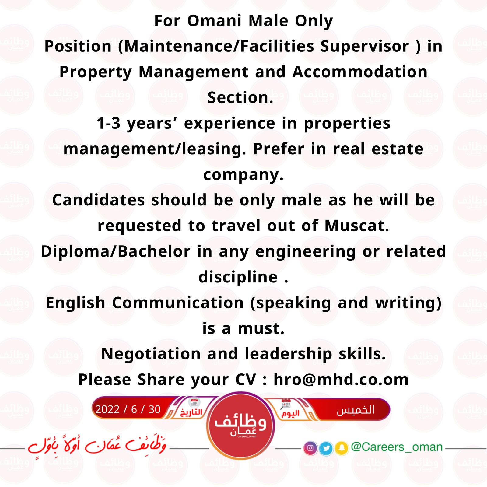 الخميس 30 / 6 / 2022 - شركة رائدة - وظيفة شاغرة ( مشرف صيانة )