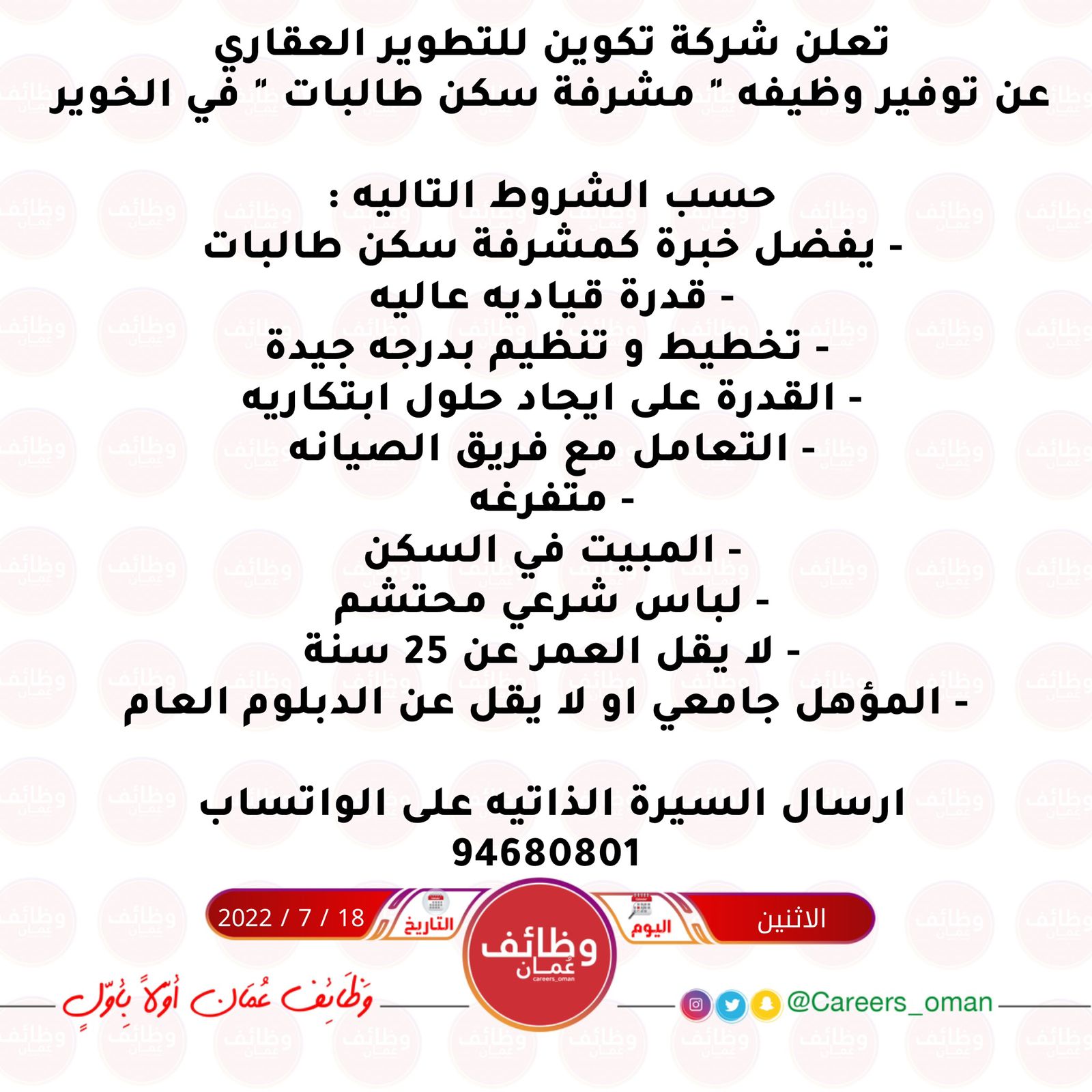 الموضوع: الاثنين 18 / 7 / 2022 - شركة تكوين للتطوير العقاري في الخوير - وظيفة شاغرة ( مشرفة سكن طالبات )