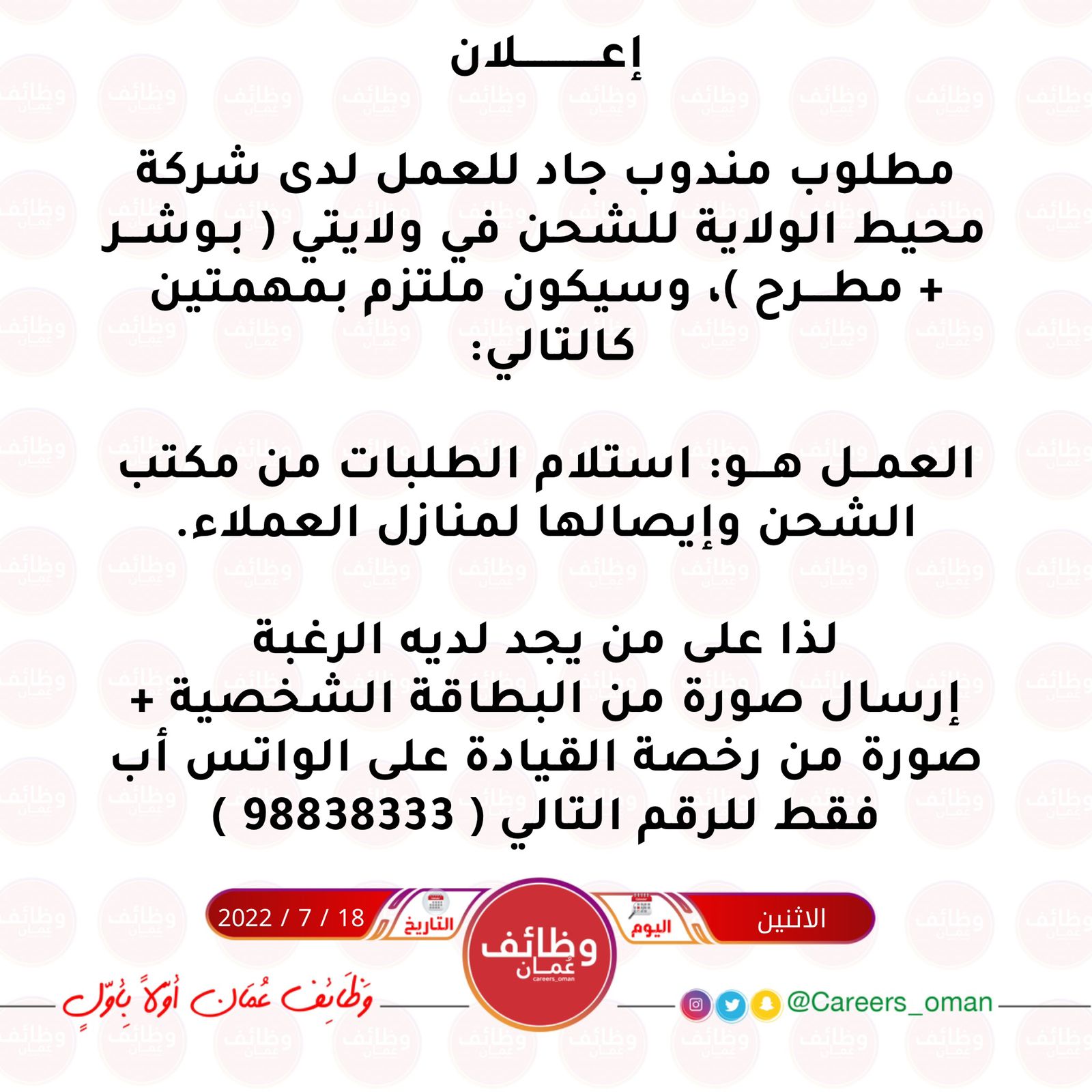 الموضوع: الاثنين 18 / 7 / 2022 - شركة محيط الولاية للشحن في مسقط - وظيفة شاغرة ( مندوب )