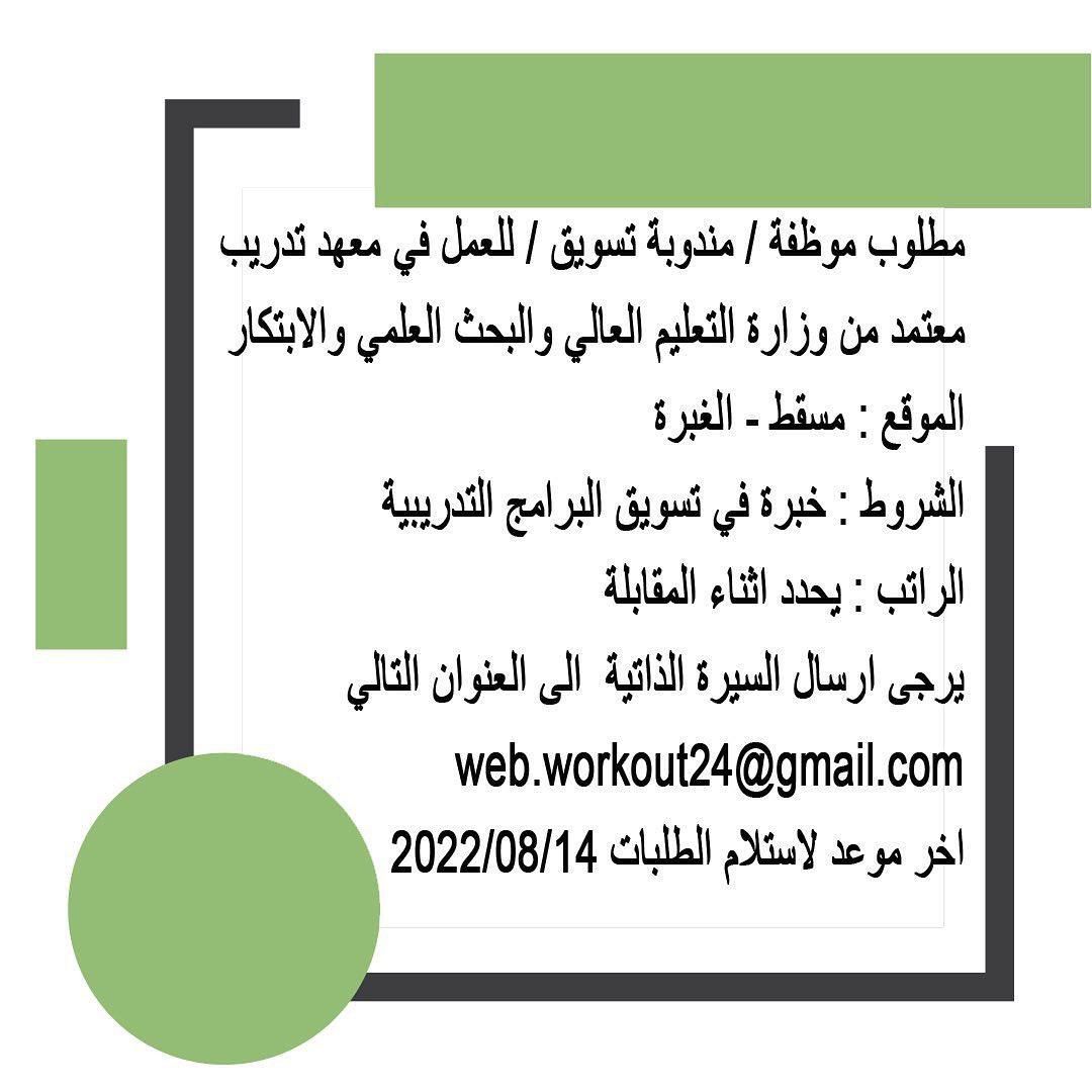 • الاربعاء 10 / 8 / 2022 - احدى المعاهد الرائدة في مسقط - وظيفة شاغرة ( موظفة مندوبة تسويق )