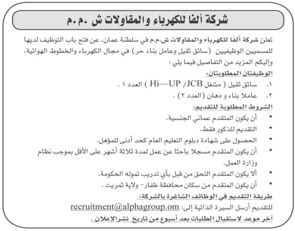 • الاحد 28 / 8 / 2022 - شركة ألفا للكهرباء والمقاولات - وظيفتين شاغرتين ( سائق ثقيل + عاملا بناء ودهان )