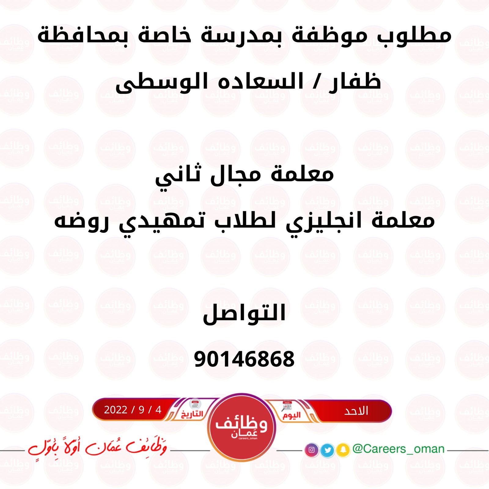 • الاحد 4 / 9 / 2022 - مدرسة خاصة بمحافظة ظفار - وظيفة شاغرة ( معلمة مجال ثاني )