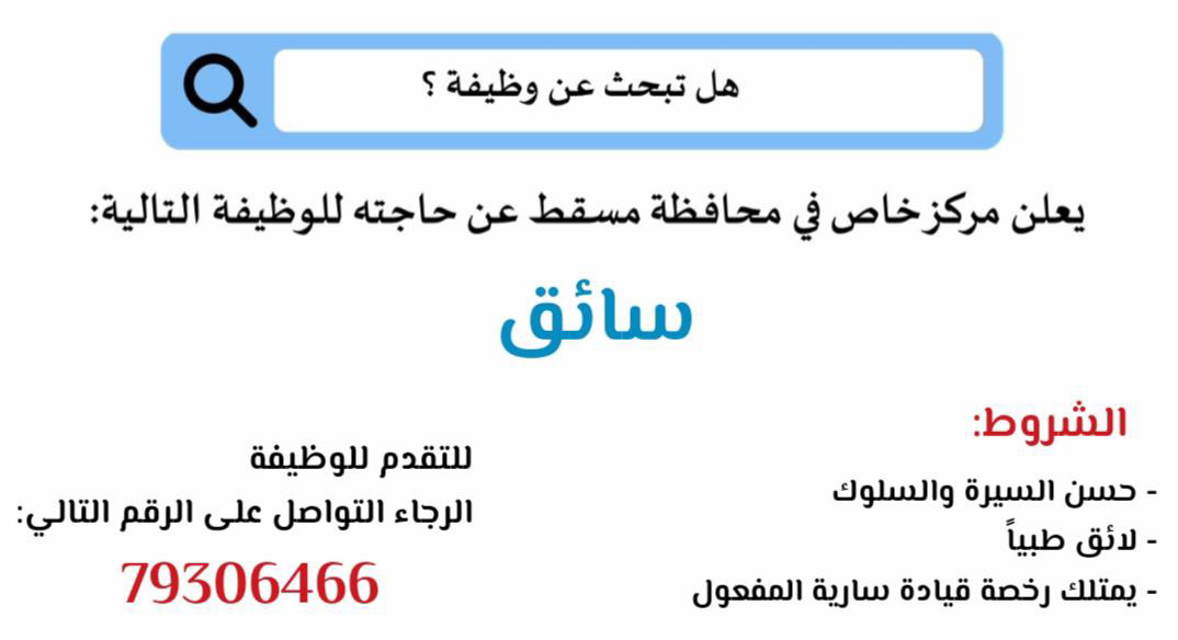 السبت 1 / 10 / 2022 - مركز خاص في مسقط - وظيفة شاغرة ( سائق )