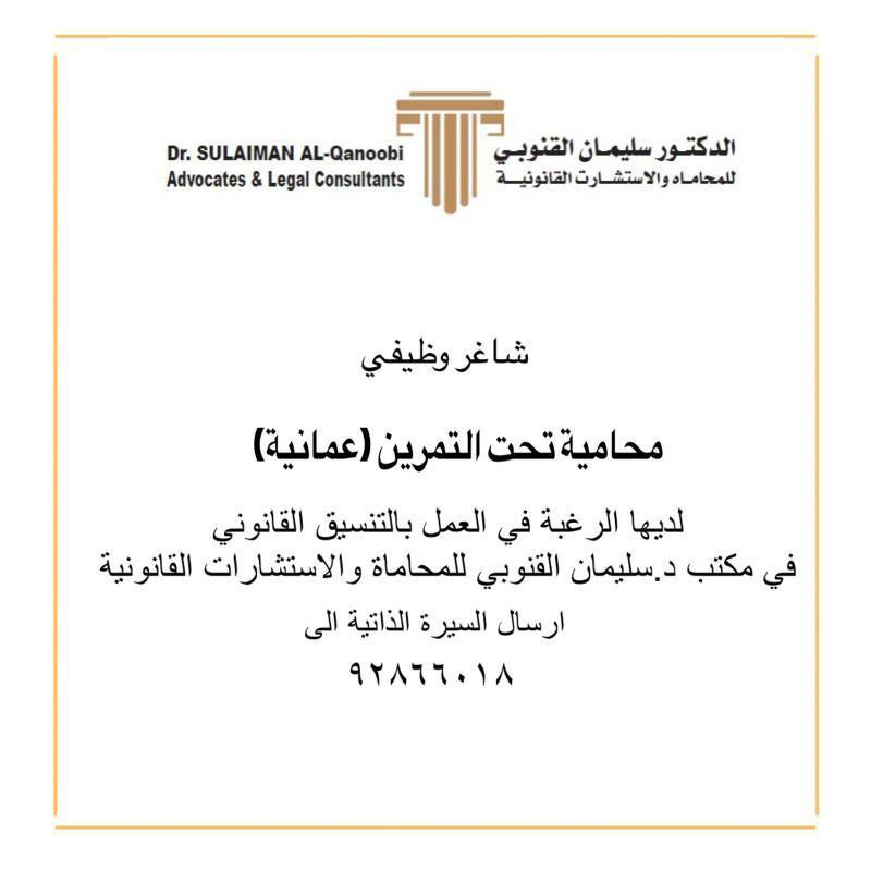 الموضوع: الخميس 6 / 10 / 2022 - الدكتور سليمان القنوبي للمحاماه والاستشـارت القانونيـة - وظيفة شاغرة ( محامية تحت التمرين عمانية