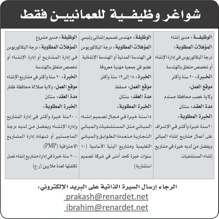 ارسل السيرة الذاتية على البريد الإلكتروني: ibrahim@renardet.net prakash@renardet.net