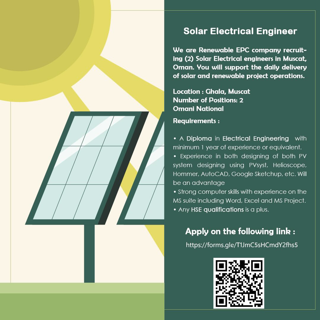 رابط التسجيل Solar Electrical Engineer https://forms.gle/8KddRPghYb3a2vGh9