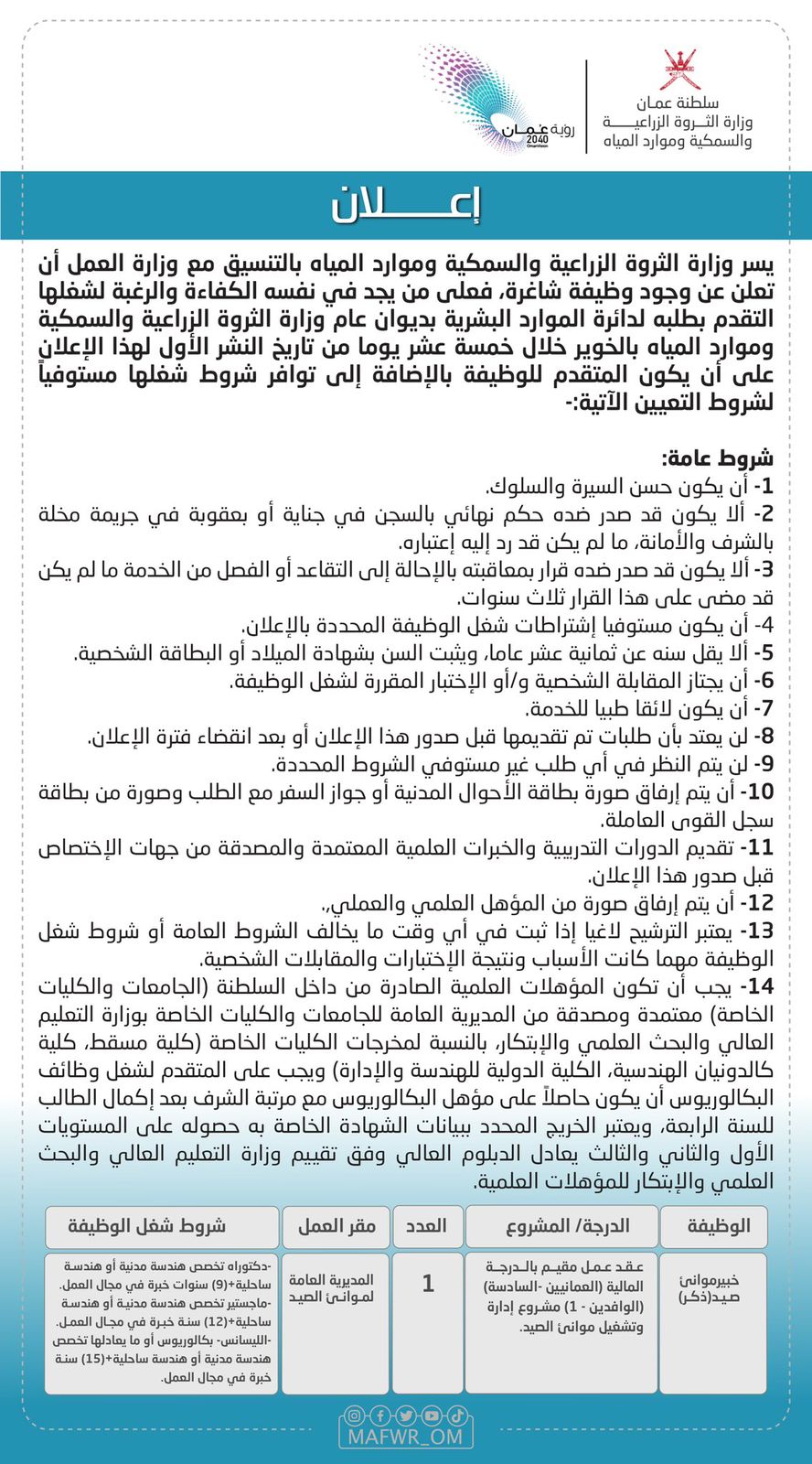 الموضوع: الاثنين 21 / 11 / 2022 - وزارة الثروة الزراعية والسمكية وموارد المياه - وظيفة شاغرة ( خبير موانئ صيد ذكر )