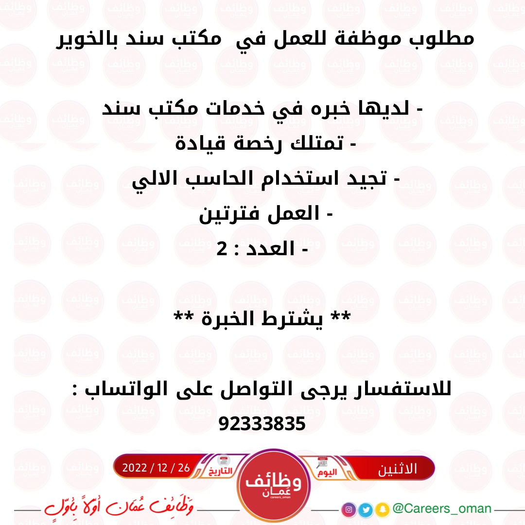 • الاثنين 26 / 12 / 2022 - مكتب سند بالخوير - وظيفة شاغرة ( موظفة لديها خبره في خدمات مكتب سند العدد 2 )
