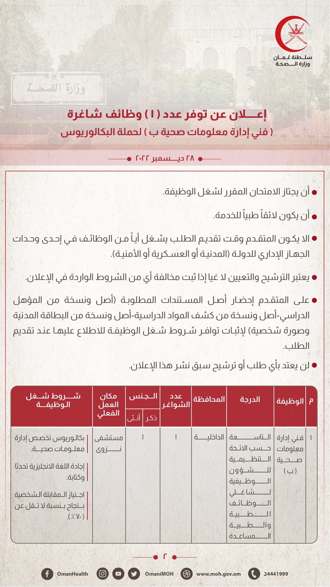 الموضوع: الاربعاء 28 / 12 / 2022 - وزارة الصحة - وظيفة شاغرة ( فني إدارة معلومات صحية (ب) لحملة البكالوريوس )