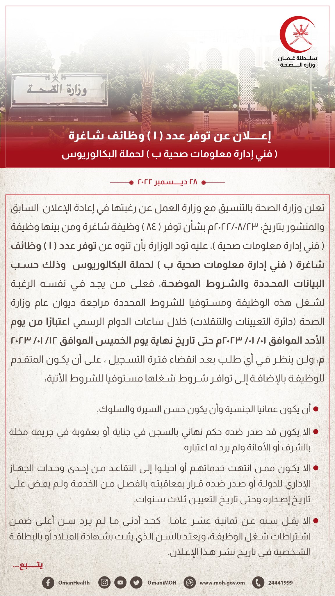 • الاربعاء 28 / 12 / 2022 - وزارة الصحة - وظيفة شاغرة ( فني إدارة معلومات صحية (ب) لحملة البكالوريوس )