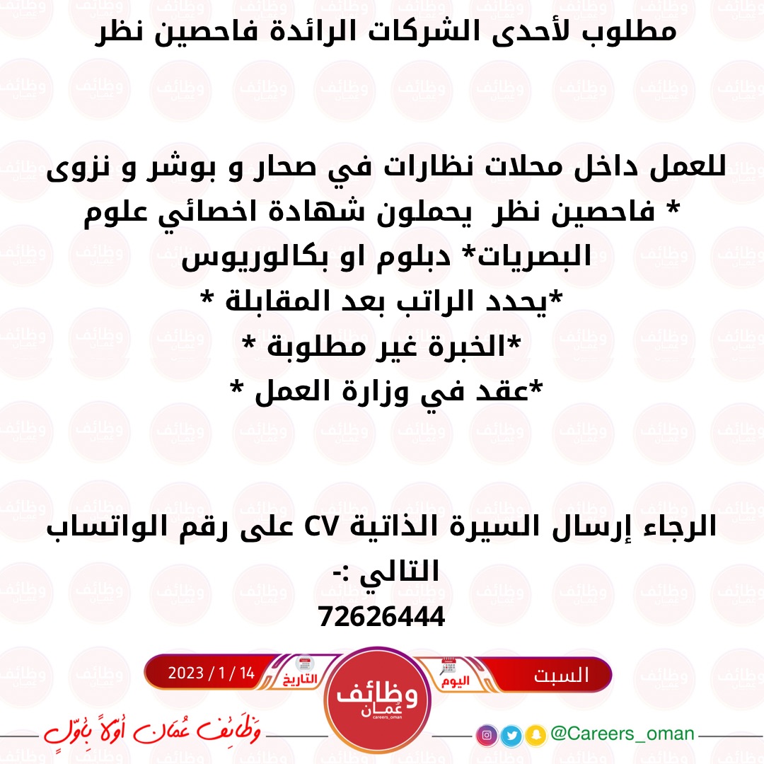 السبت 14 / 1 / 2023 - احدى الشركات الرائد - فرص وظيفية شاغرة ( فاحصين نظر )