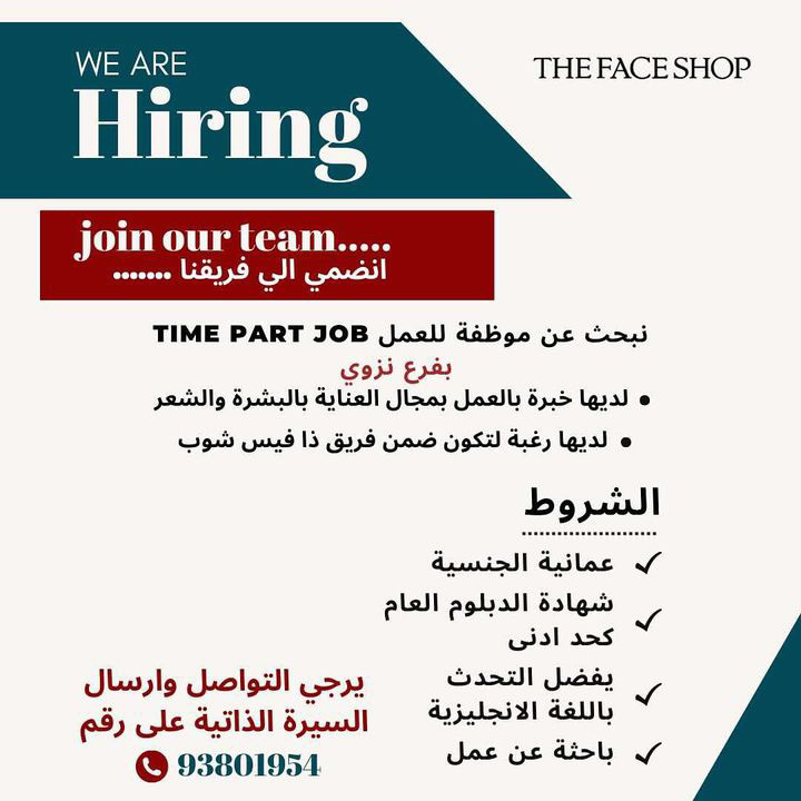 • الاربعاء 25 / 1 / 2023 - محل ذا فيس شوب العناية بالبشرة والشعر - فرص وظيفية شاغرة ( موظفات للعمل في فرع بركاء + نزوى )