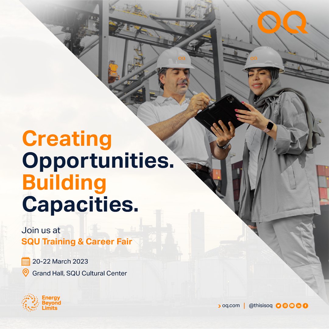 • الاثنين 13 / 3 / 2023 - شركة اوكيو - معرض الوظائف والتدريب بجامعة السلطان قابوس في الفترة من 20 إلى 22 مارس 2023م.