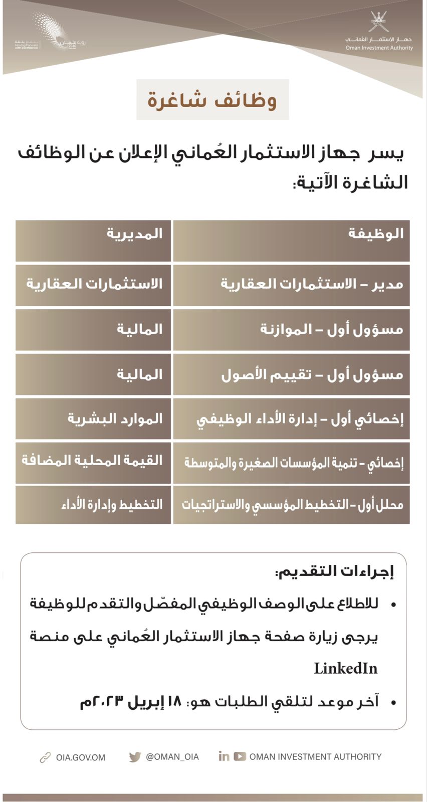 الموضوع: الأربعاء 5 / 4 / 2023 - جهاز الاستثمار العماني - 6 وظائف شاغرة