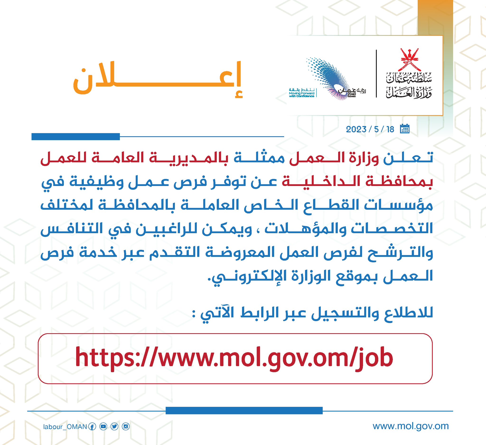 انستجرام : careers__oman تويتر : careers_oman قناة على التلجرام : careers_oman الفيس بوك: careersoman سناب شات : careers_oman تابع جديد الوظائف على أخبار جوجل https://news.google.com/s/CBIwpO6O2q...ar&sceid=OM:ar