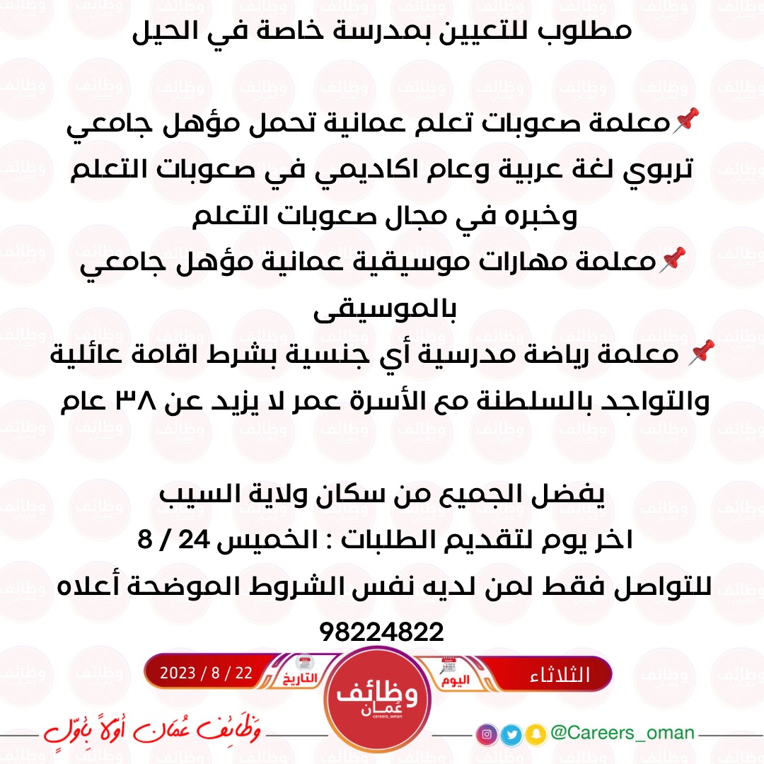 • الثلاثاء 22 / 8 / 2023 - مدرسة في الحيل - وظائف شاغرة ( معلمات )