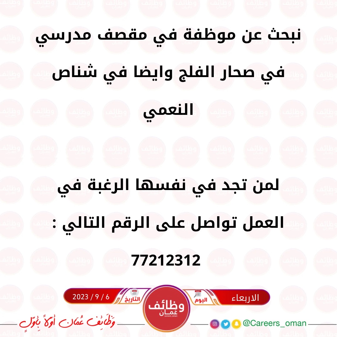 الموضوع: الاربعاء 6 / 9 / 2023 - مدرسة في صحار وشناص - وظيفة شاغرة ( موظفة )