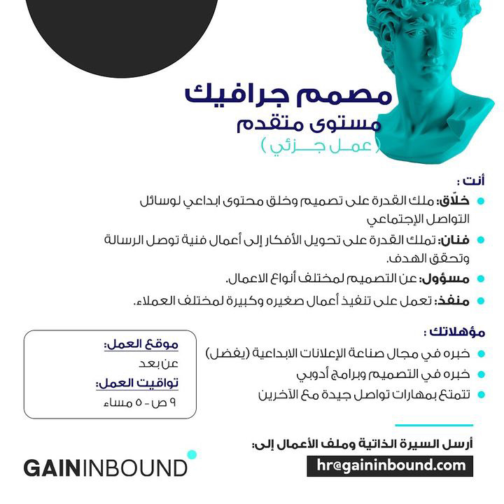 • الخميس 7 / 9 / 2023 - شركة Gain Inbound - وظيفة شاغرة ( مصمم جرافيك )