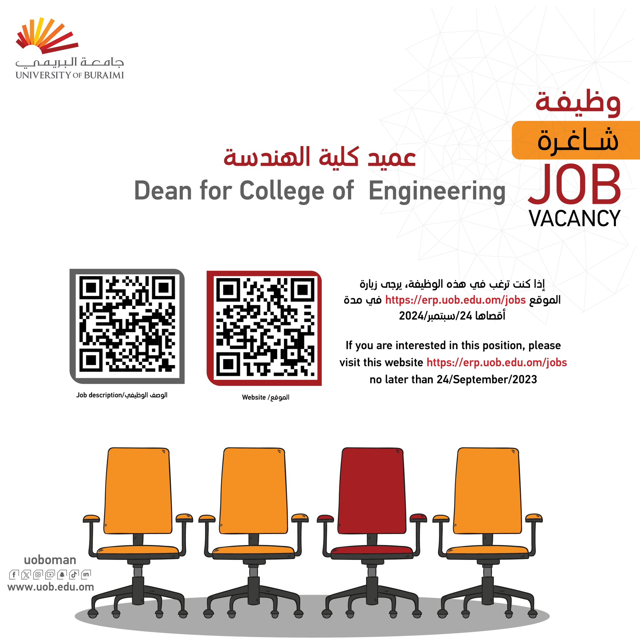 الاحد 10 / 9 / 2023 - جامعة البريمي - وظيفة شاغرة ( عميد كلية الهندسة )