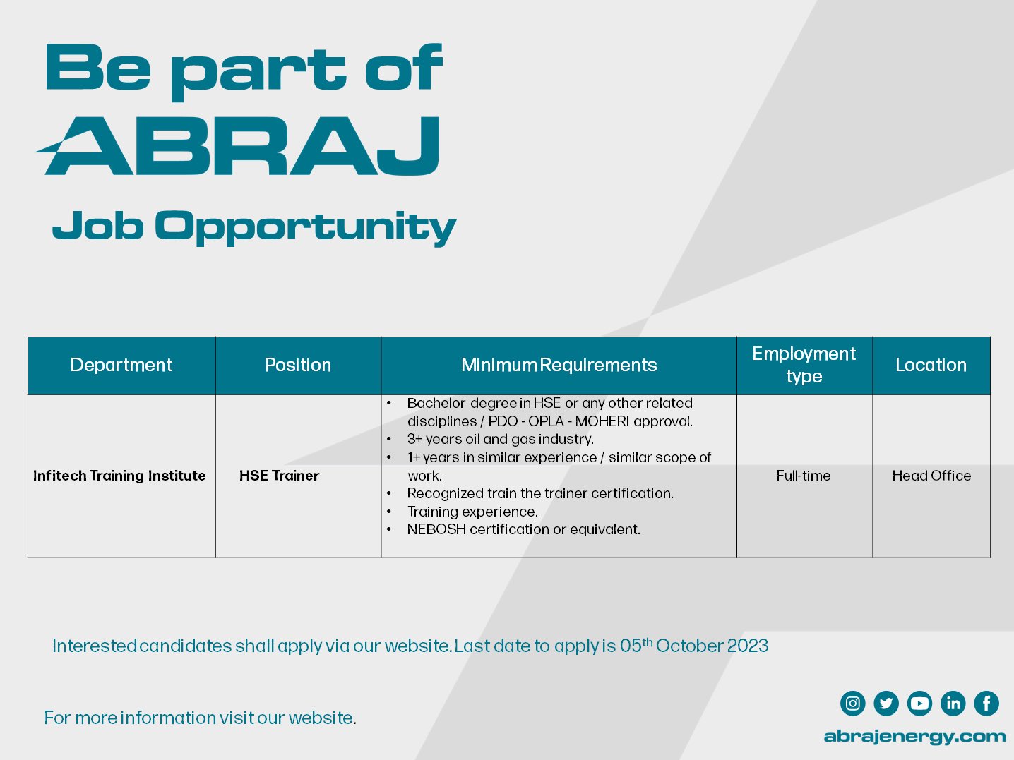 شركة أبراج لخدمات الطاقة - وظيفة شاغرة ( HSE Trainer )