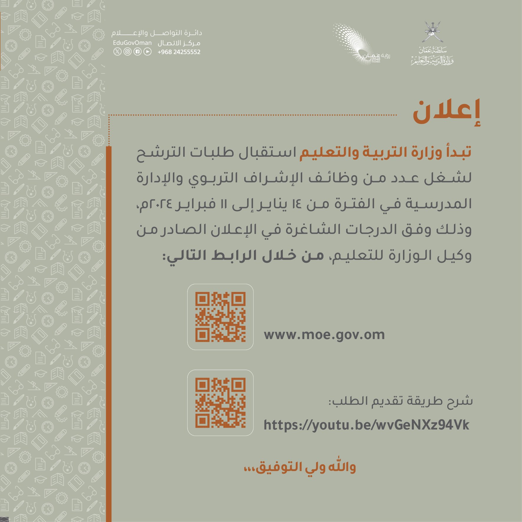 • وزارة التربية والتعليم - استقبال طلبات الترشح لشغل عدد من وظائف الإشراف التربوي والإدارة المدرسية