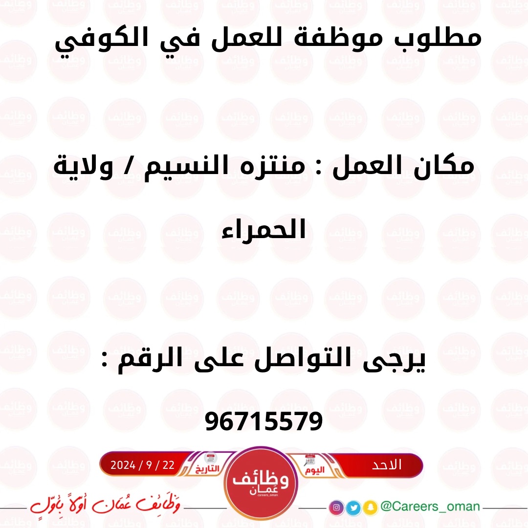 محل كوفي في ولاية الحمراء - وظيفة شاغرة ( موظفة )