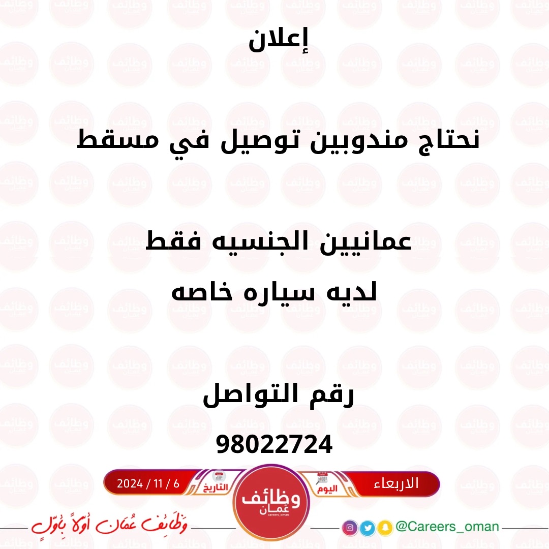 شركة توصيل في مسقط - فرص وظيفية ( مندوبين توصيل )