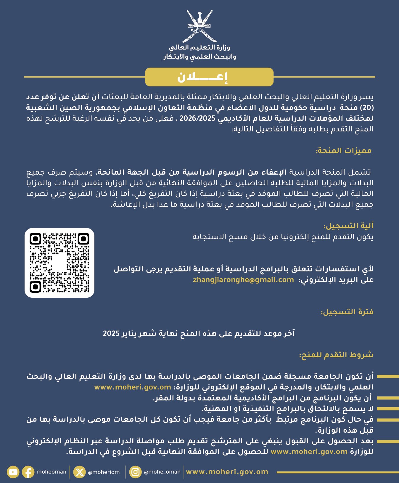 وزارة التعليم العالي والبحث العلمي والابتكار - 20 منحة دراسية حكومية للدول الأعضاء في منظمة التعاون الإسلامي بجمهورية الصين الشعبية لمختلف المؤهلات الدراسية