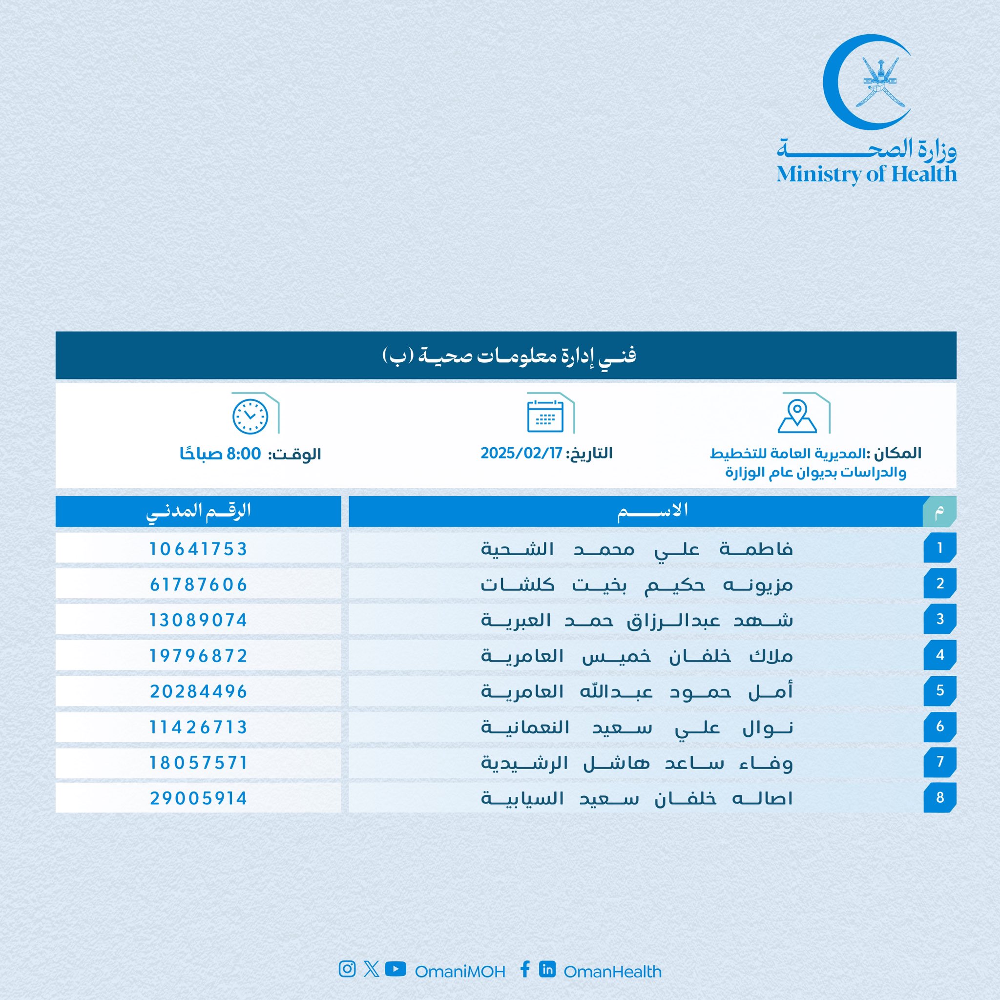 وزارة الصحة - أسماء مواطنات لأجراء المقابلة الشخصية لشغل وظيفة (فني إدارة معلومات صحية (ب)، (فني إدارة معلومات صحية)