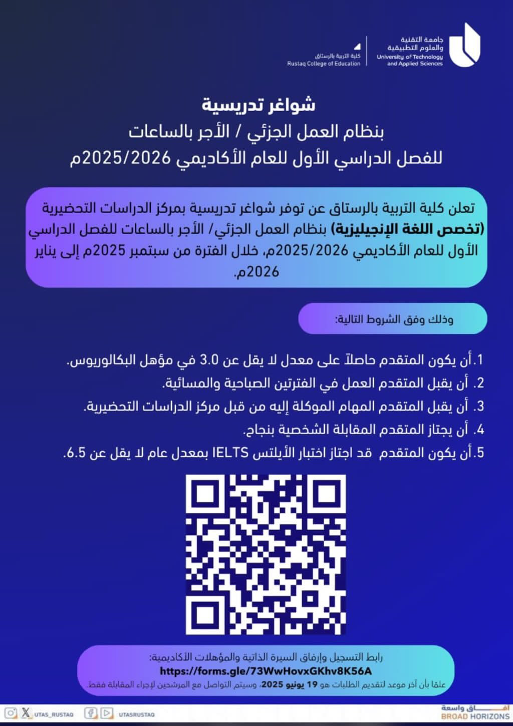 الموضوع: كلية التربية بالرستاق - شواغر تدريسية بنظام العمل الجزئي / الأجر بالساعات