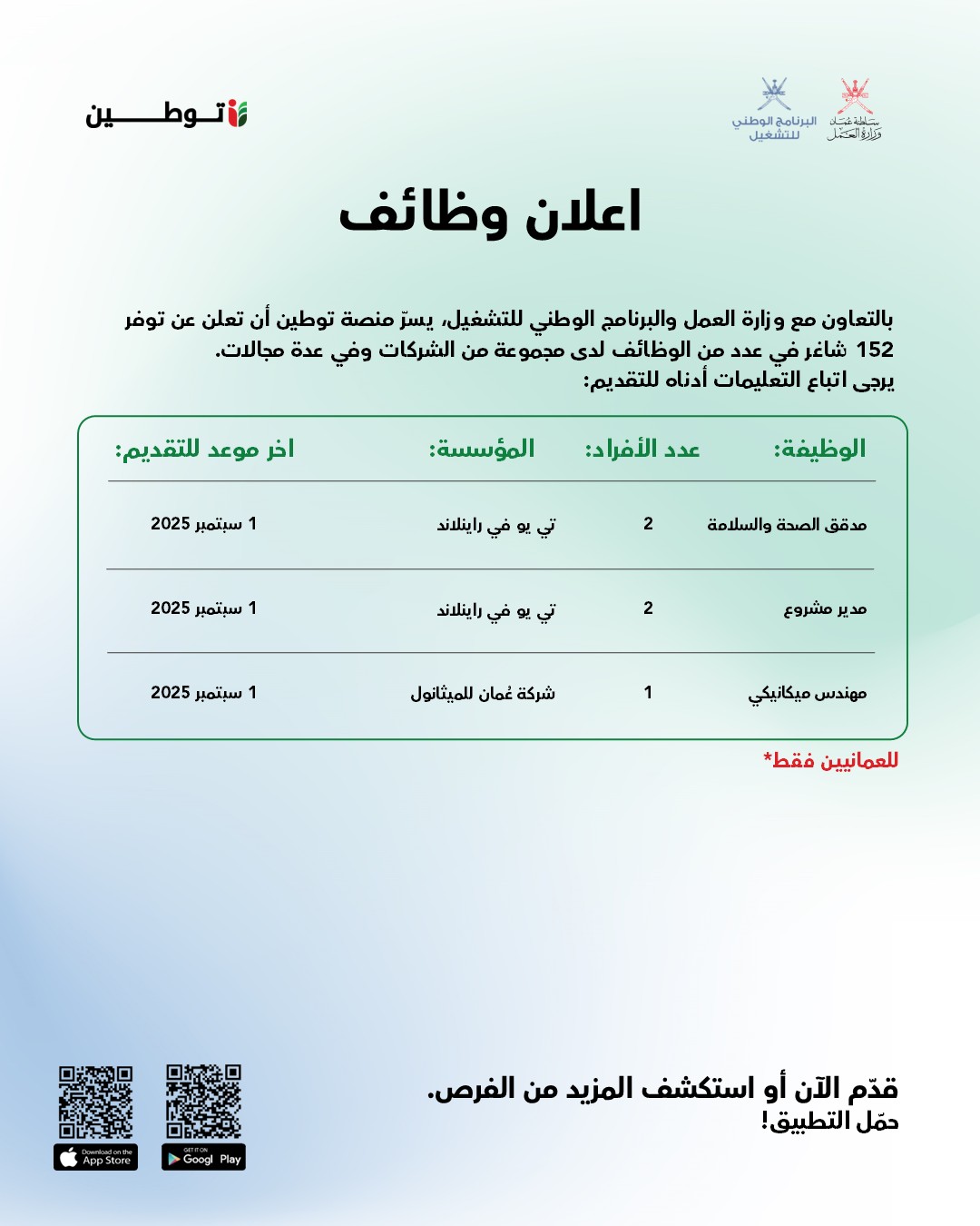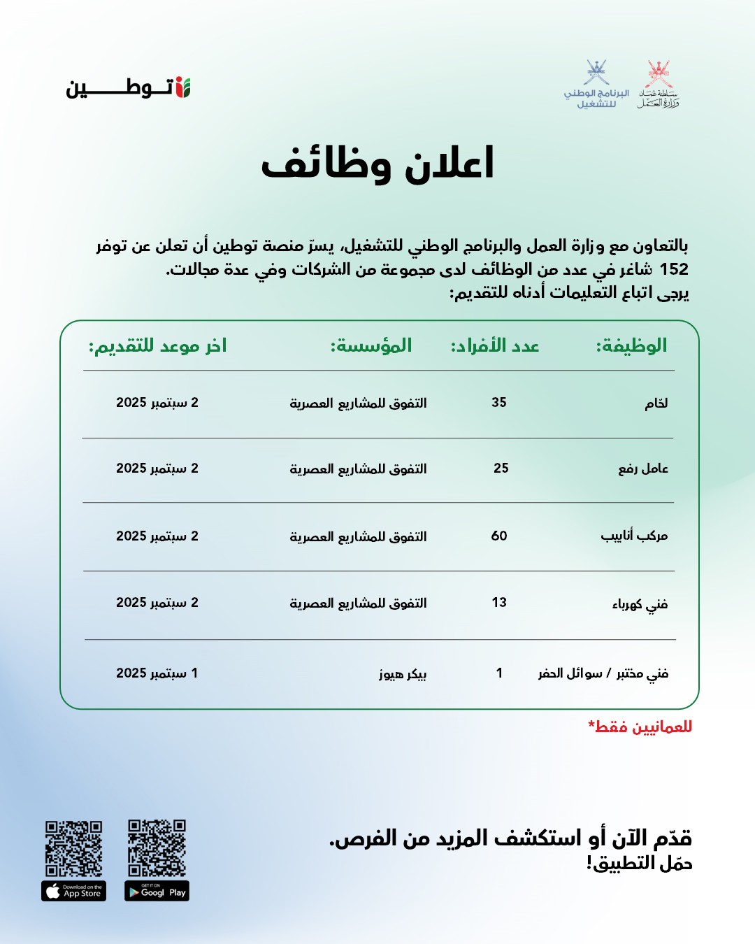 انستجرام : careers__oman تويتر : careers_oman قناة على التلجرام : careers_oman الفيس بوك: careersoman سناب شات : careers_oman تابع جديد الوظائف على أخبار جوجل https://news.google.com/s/CBIwpO6O2q...ar&sceid=OM:ar