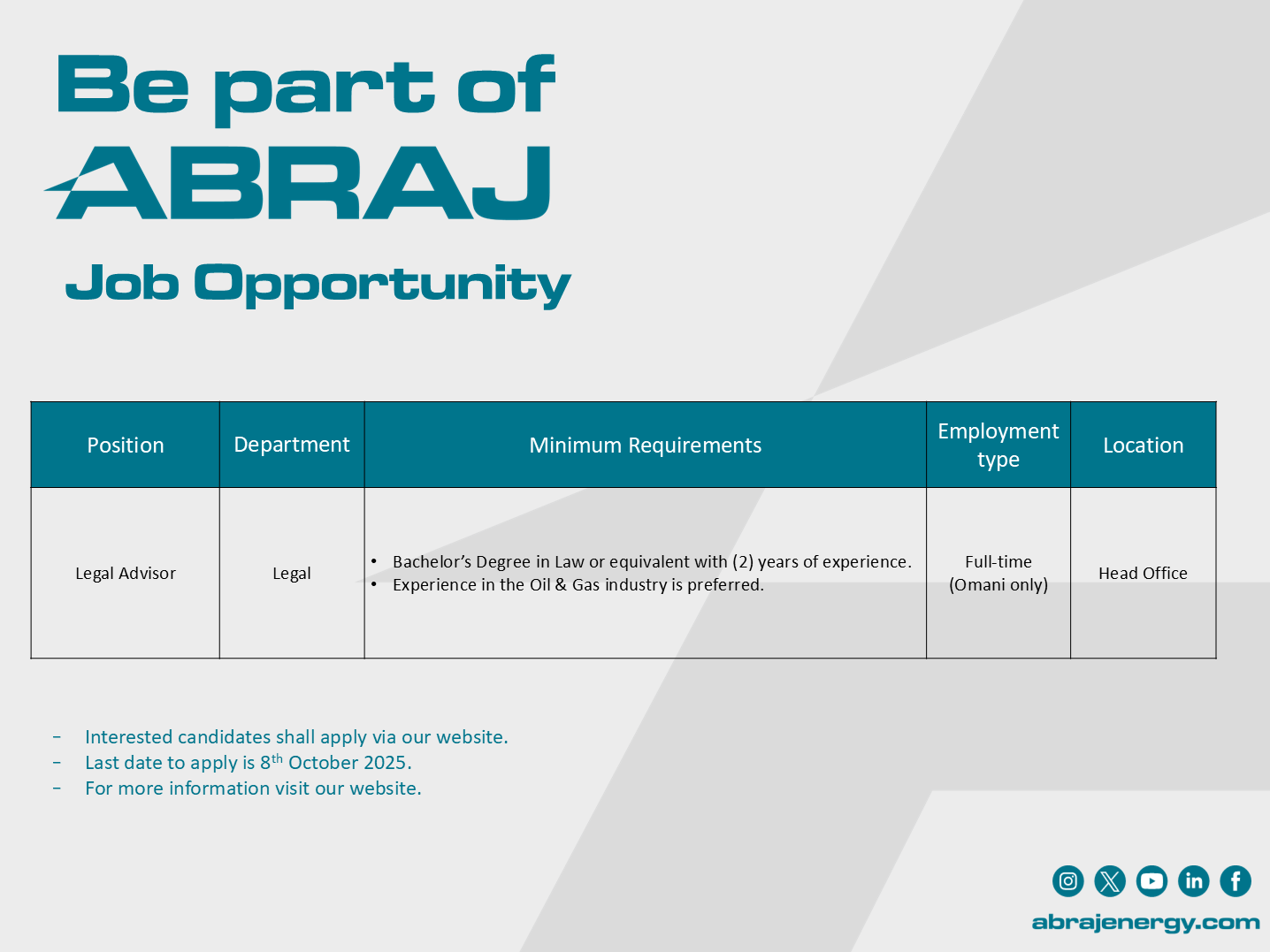 الموضوع: شركة أبراج لخدمات الطاقة - وظيفتين شاغرتين
