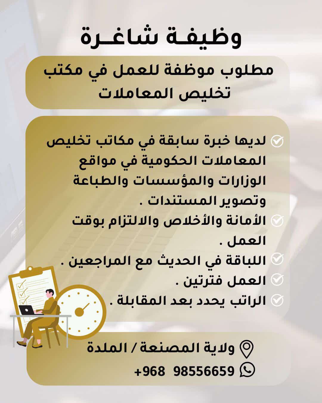 • مكتب تخليص المعاملات في المصنعة - وظيفة شاغرة ( موظفة )