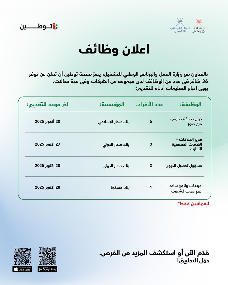 انستجرام : careers__oman تويتر : careers_oman قناة على التلجرام : careers_oman الفيس بوك: careersoman سناب شات : careers_oman تابع جديد الوظائف على أخبار جوجل https://news.google.com/s/CBIwpO6O2q...ar&sceid=OM:ar