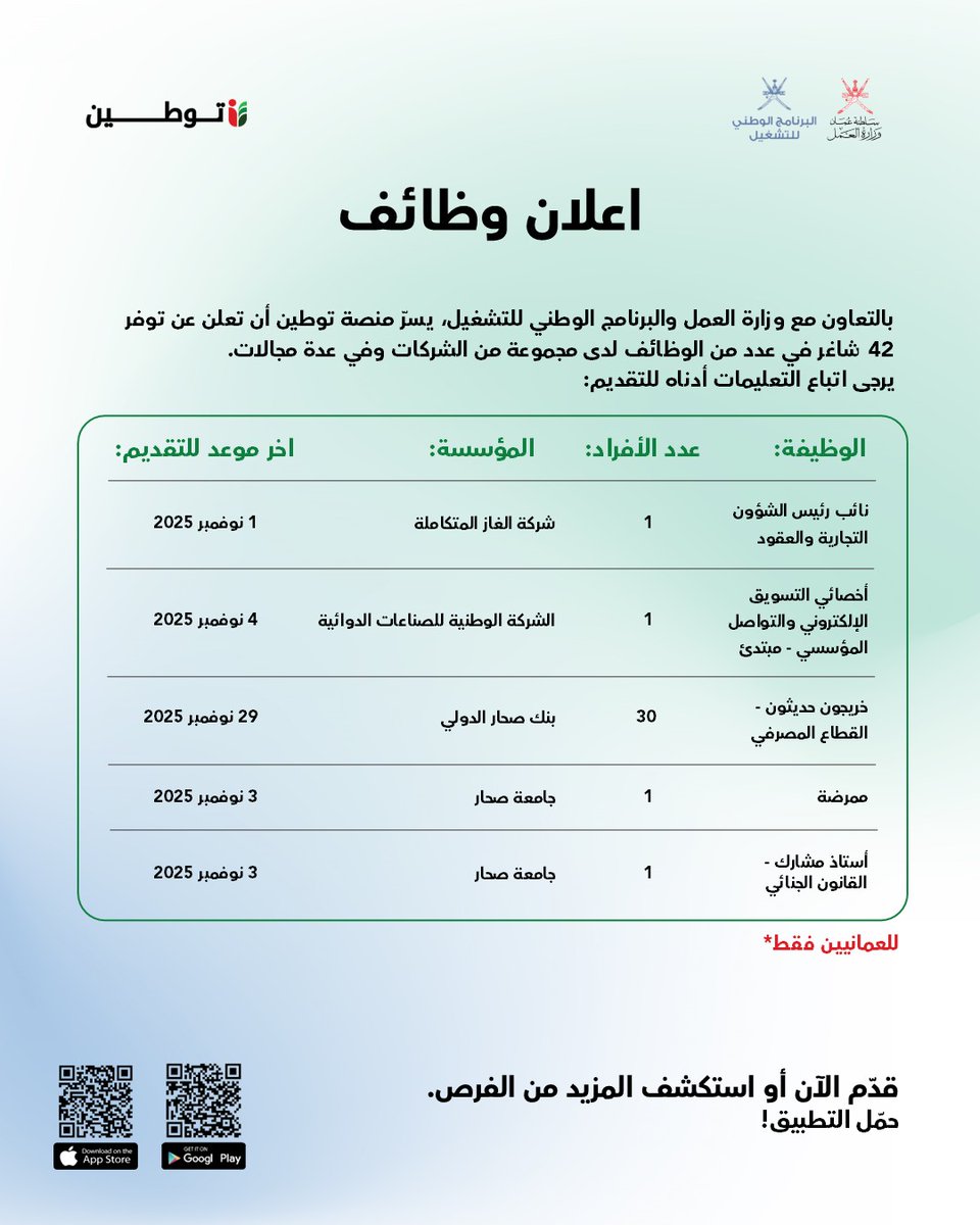 انستجرام : careers__oman تويتر : careers_oman قناة على التلجرام : careers_oman الفيس بوك: careersoman سناب شات : careers_oman تابع جديد الوظائف على أخبار جوجل https://news.google.com/s/CBIwpO6O2q...ar&sceid=OM:ar