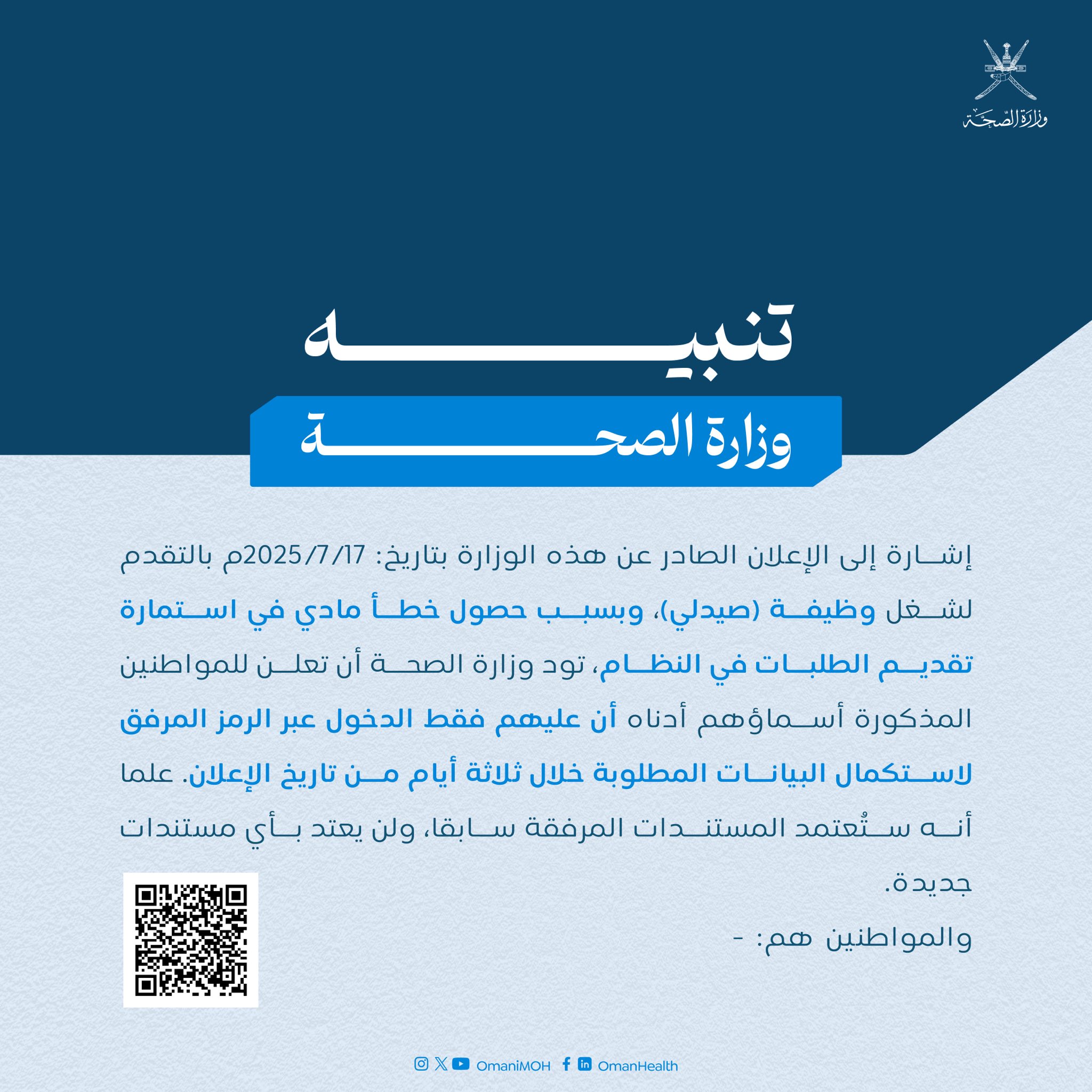• وزارة الصحة - تنبيه بخصوص الإعلان الصادر عن وزارة الصحة بتاريخ: 17/7/2025 لشغل وظيفة (صيدلي)