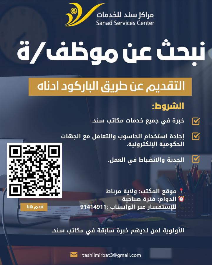 • مركز سند للخدمات في ولاية مرباط - وظيفة شاغرة ( موظف / موظفة )