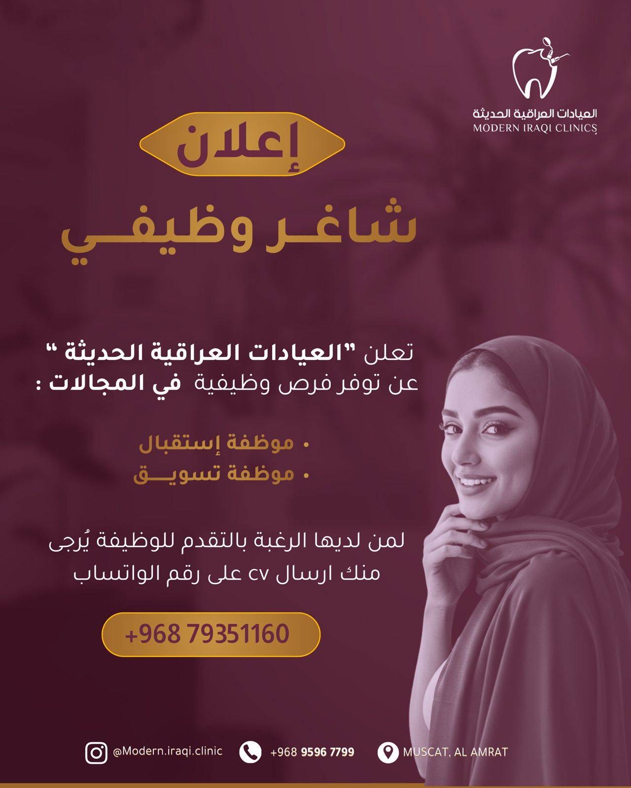 العيادات العراقية الحديثة في العامرات - وظيفة شاغرة ( موظفة إستقبال + موظفة تسويق )
