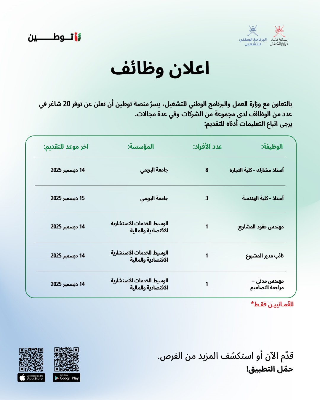انستجرام : careers__oman تويتر : careers_oman قناة على التلجرام : careers_oman الفيس بوك: careersoman سناب شات : careers_oman تابع جديد الوظائف على أخبار جوجل https://news.google.com/s/CBIwpO6O2q...ar&sceid=OM:ar