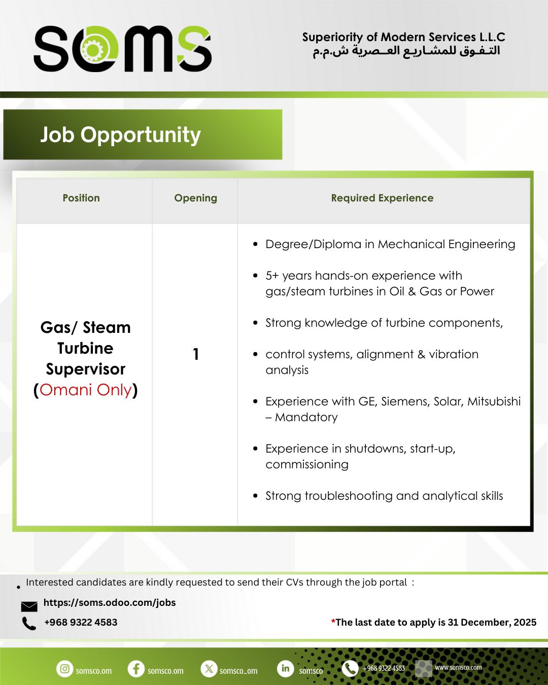 شركة التفوق للخدمات العصرية - وظيفة شاغرة ( Gas/ Steam Turbine Supervisor )