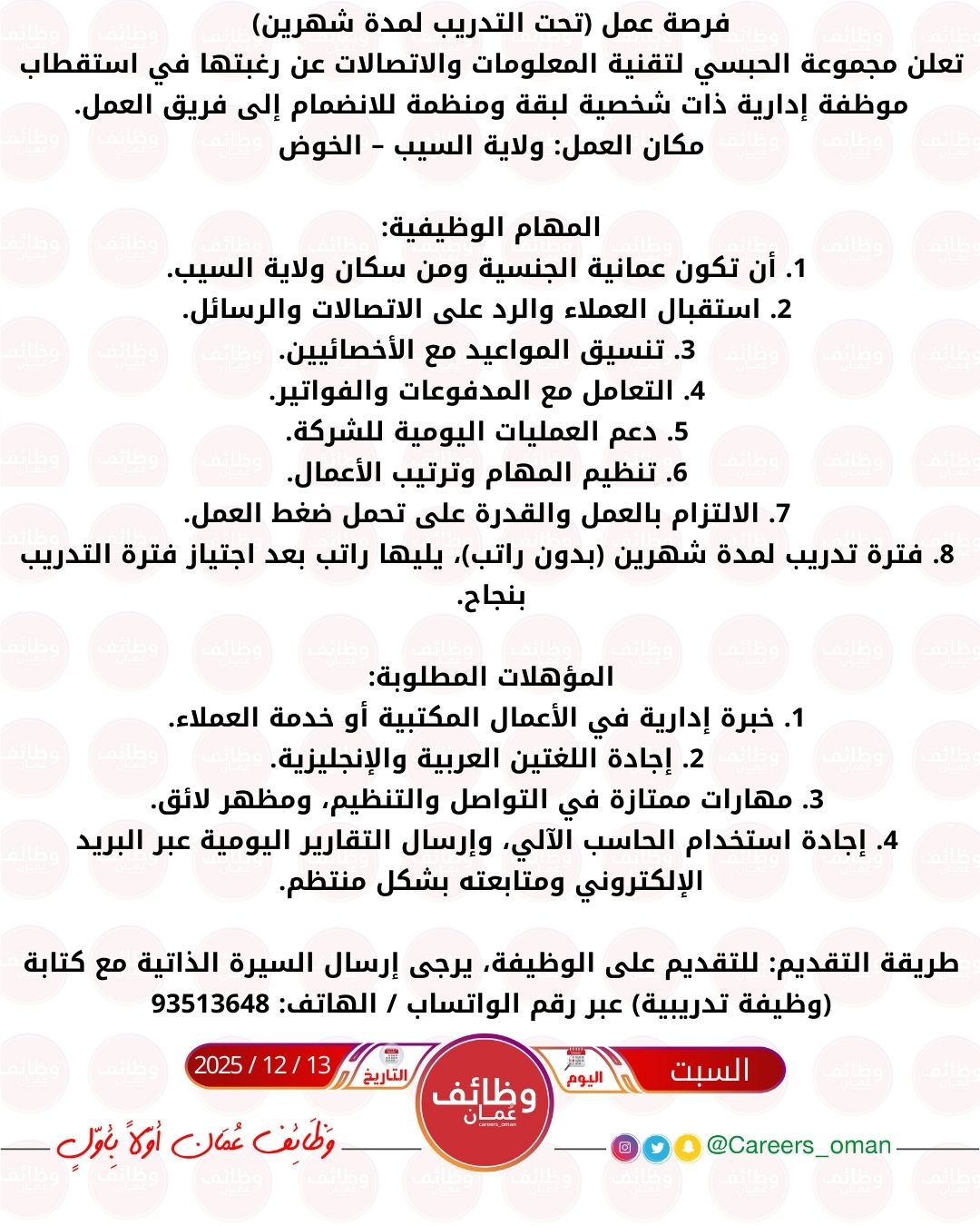 الموضوع: مجموعة الحبسي لتقنية المعلومات والاتصالات في الخوض - فرصة عمل تحت التدريب لمدة شهرين ( موظفة إدارية )
