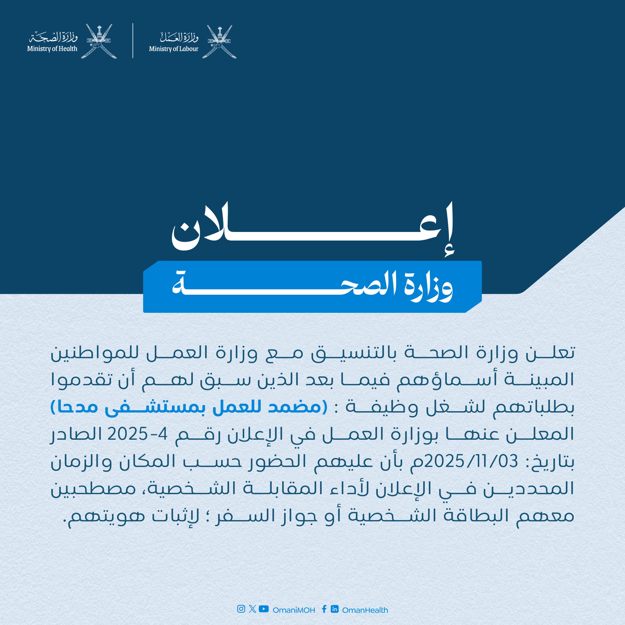 وزارة الصحة - أسماء مواطنين لأداء المقابلة الشخصية لشغل وظيفة ( مضمد )
