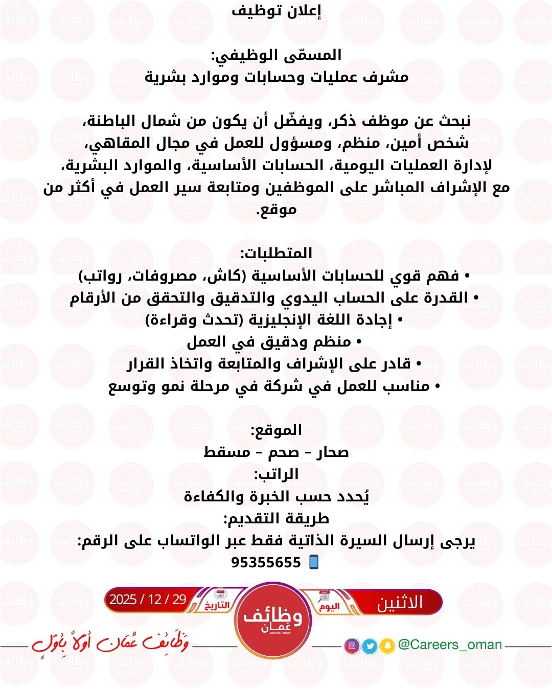 الموضوع: احدى الشركات الرائدة - وظيفة شاغرة ( مشرف عمليات وحسابات وموارد بشرية )